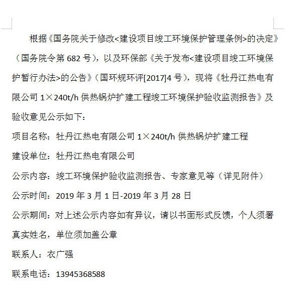 牡丹江熱電有限公司1×240t/h供熱鍋爐擴(kuò)建工程項(xiàng)目竣工環(huán)境保護(hù)驗(yàn)收監(jiān)測(cè)公示